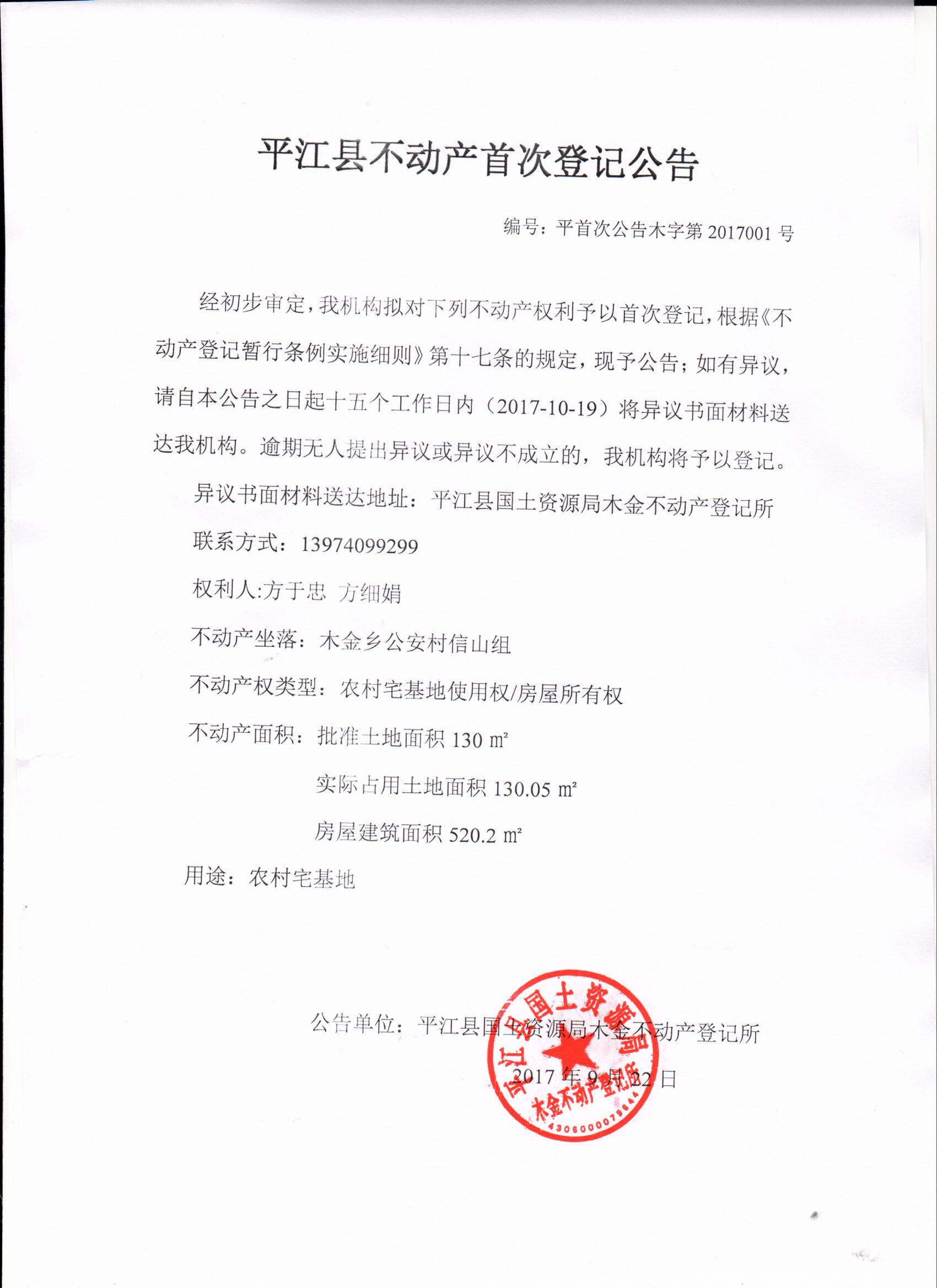 方于忠、方细娟不动产首次登记公告