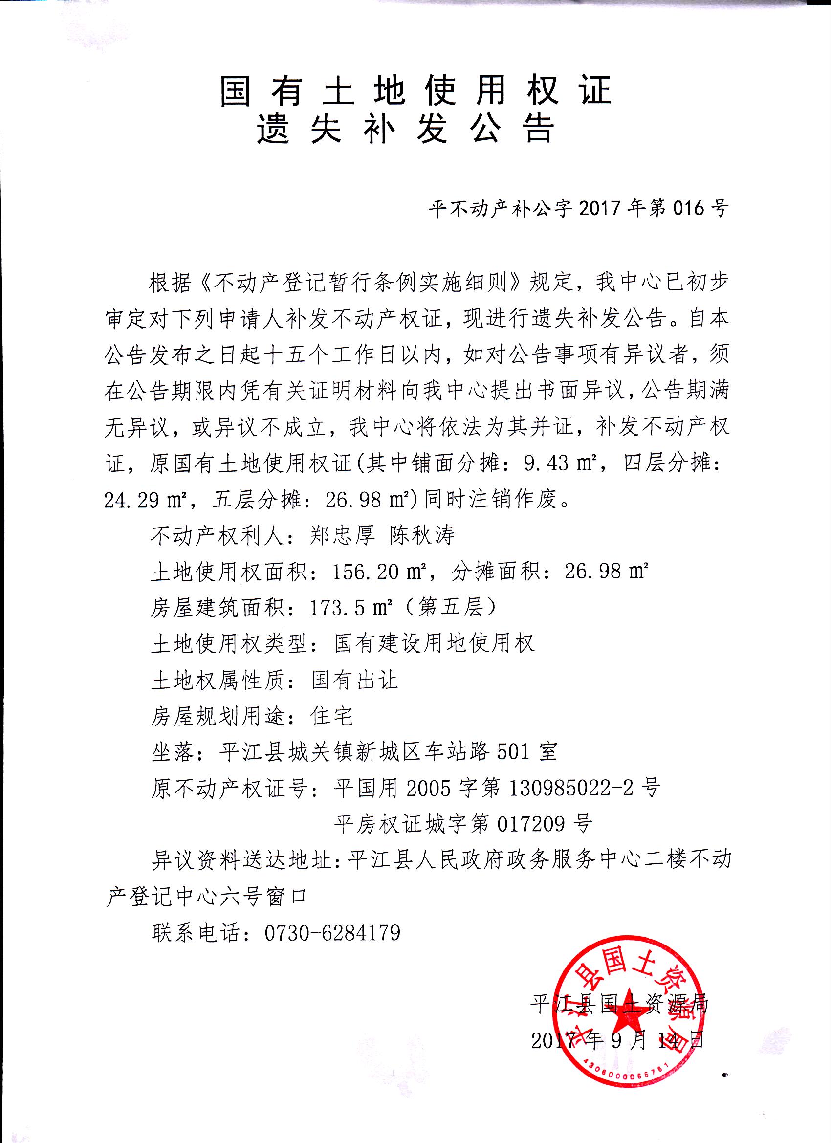 郑忠厚、陈秋涛国有土地使用权证遗失补发公告