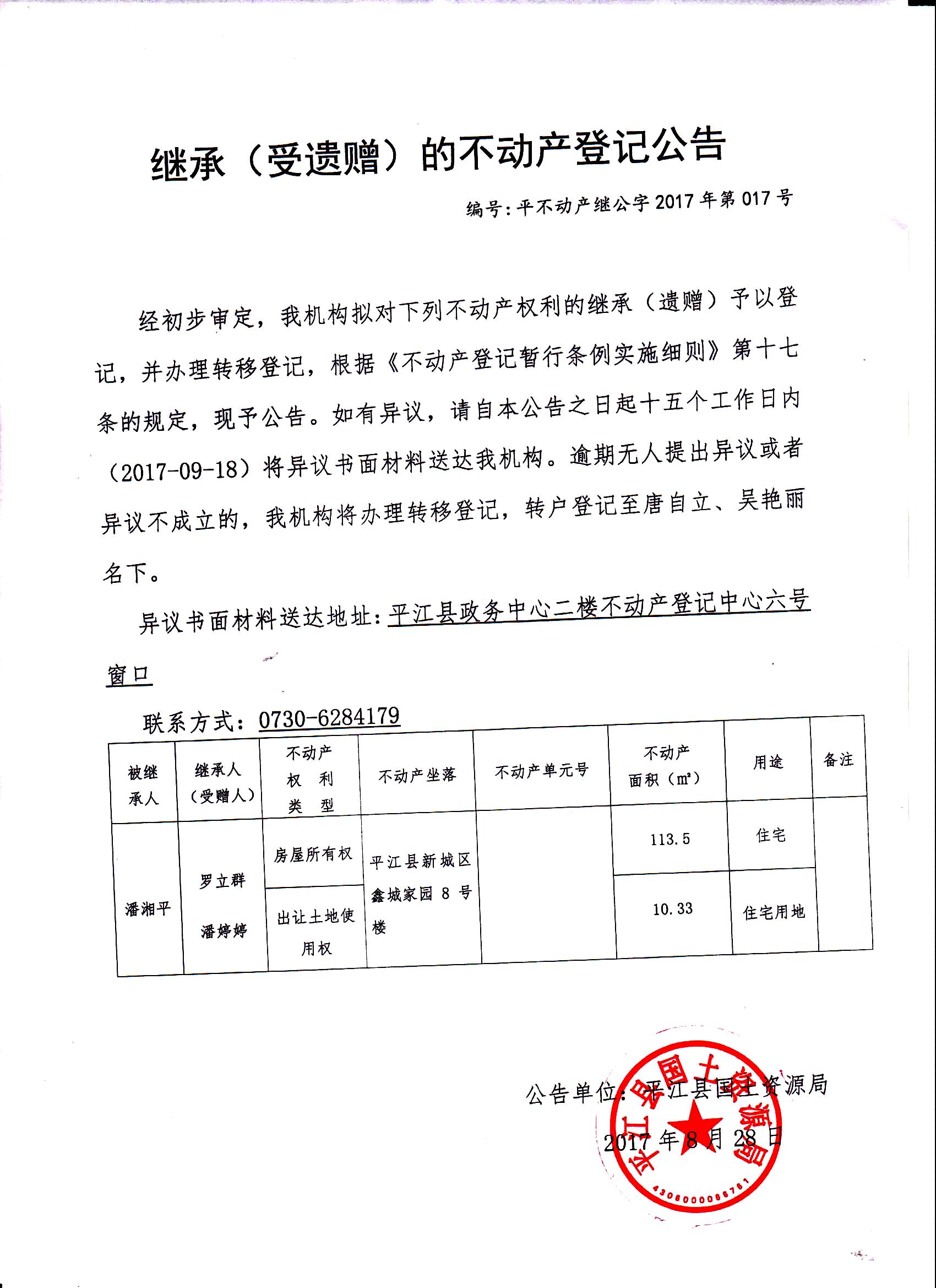 罗立群、潘婷婷继承(受遗赠)的不动产登记公告