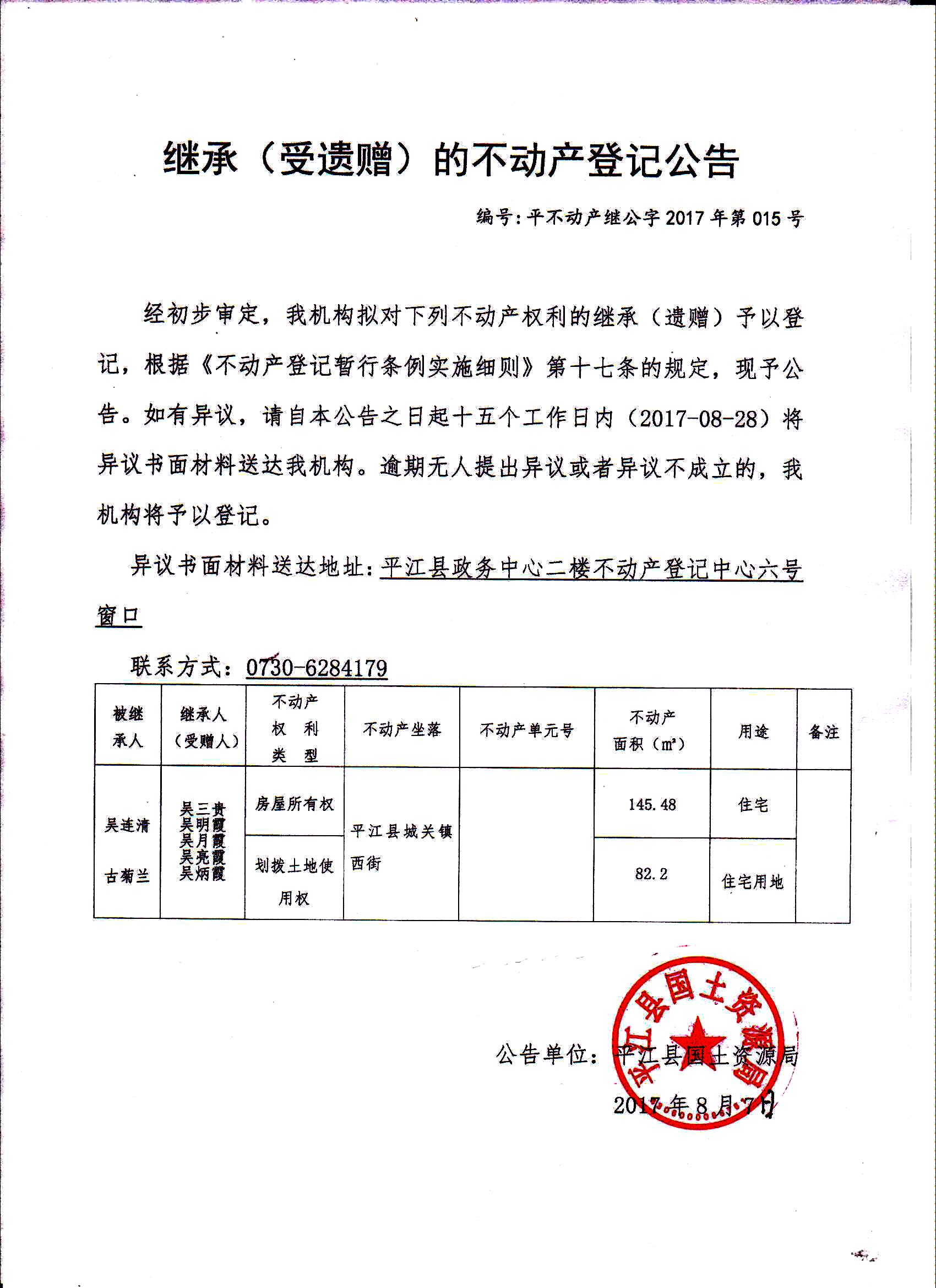 吴三贵等5人继承(受遗赠)的不动产登记公告
