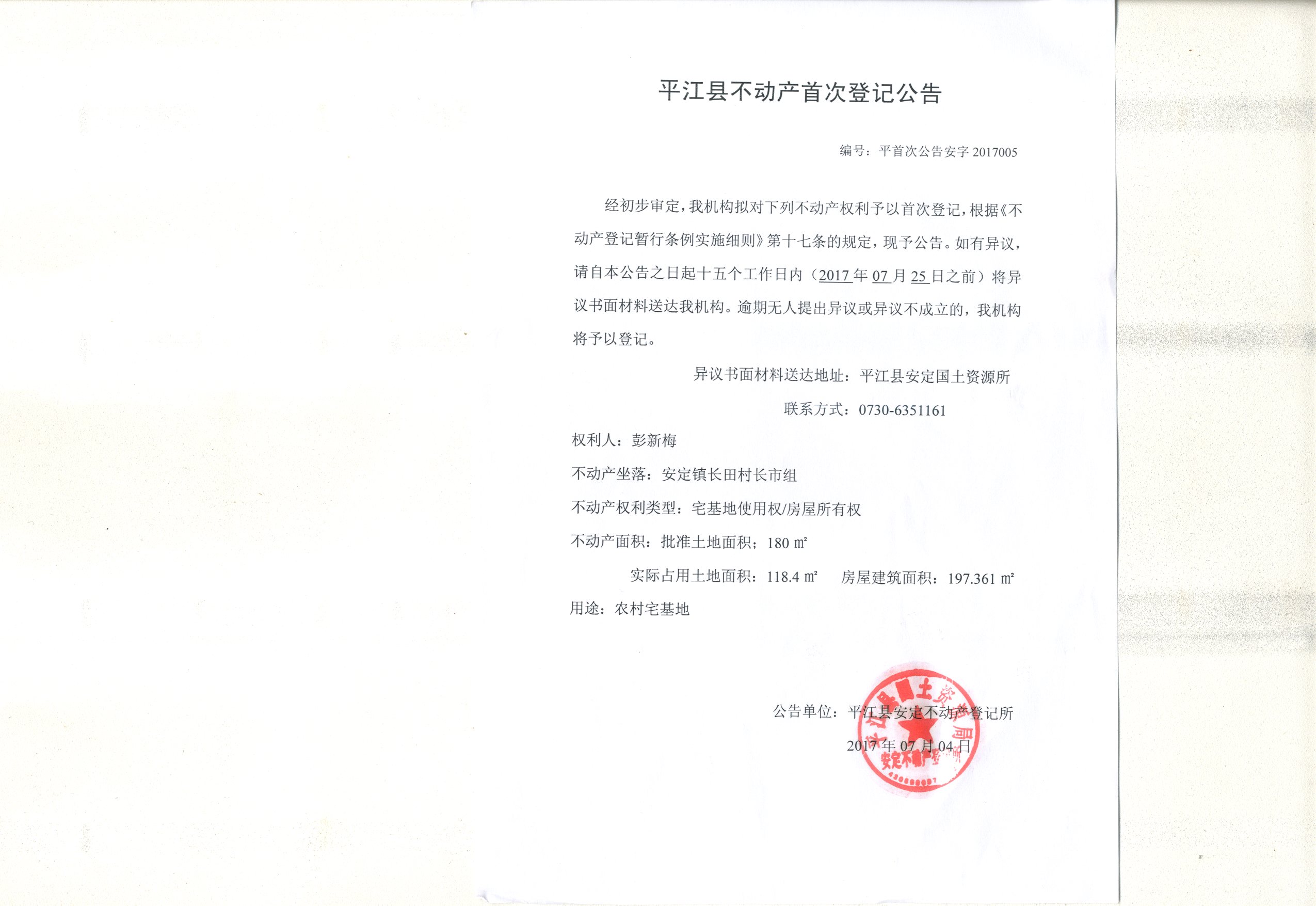 彭新梅不动产首次登记公告