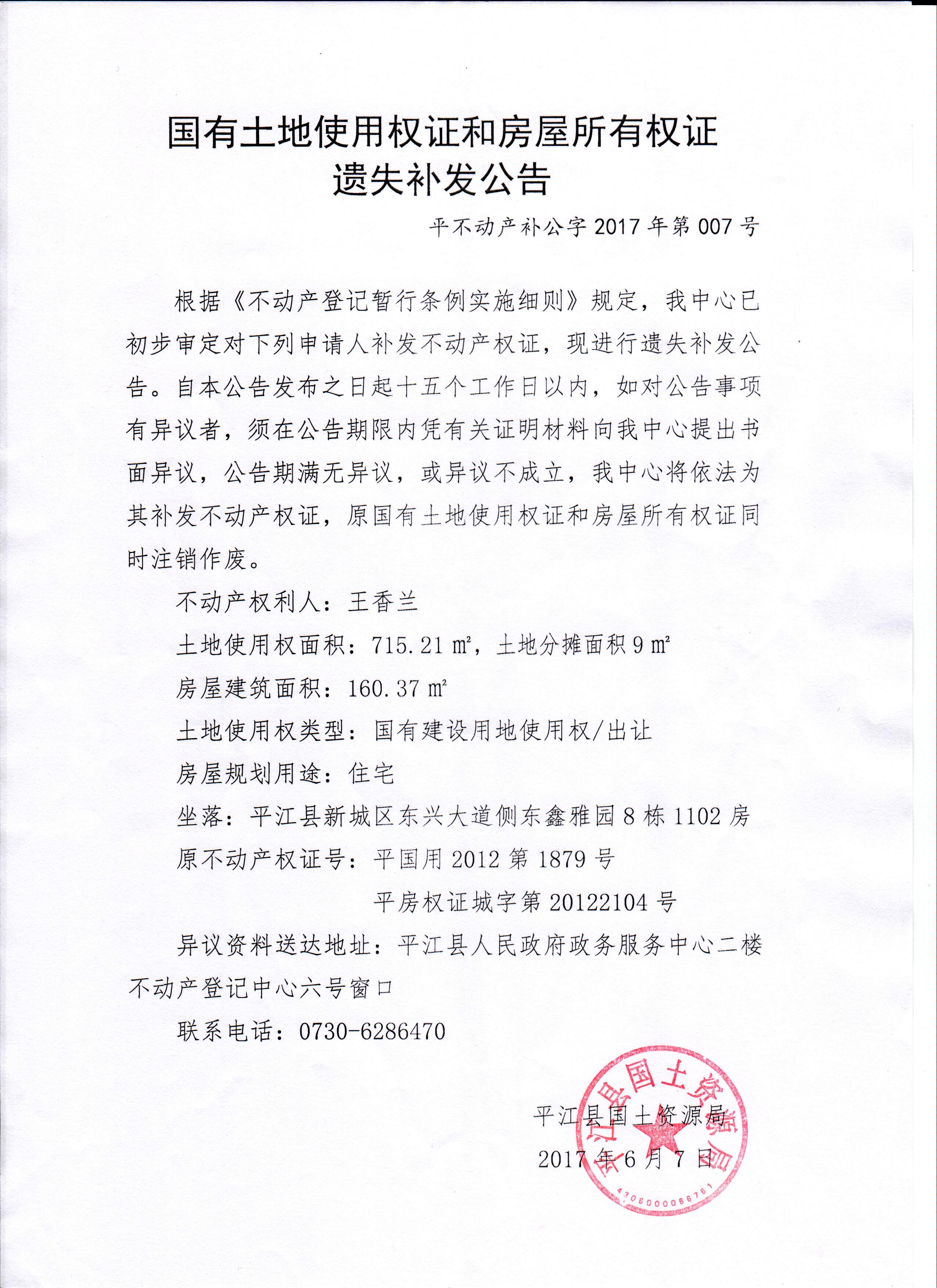 王香兰国有土地使用权证和房屋所有权证遗失补证公告2017007号
