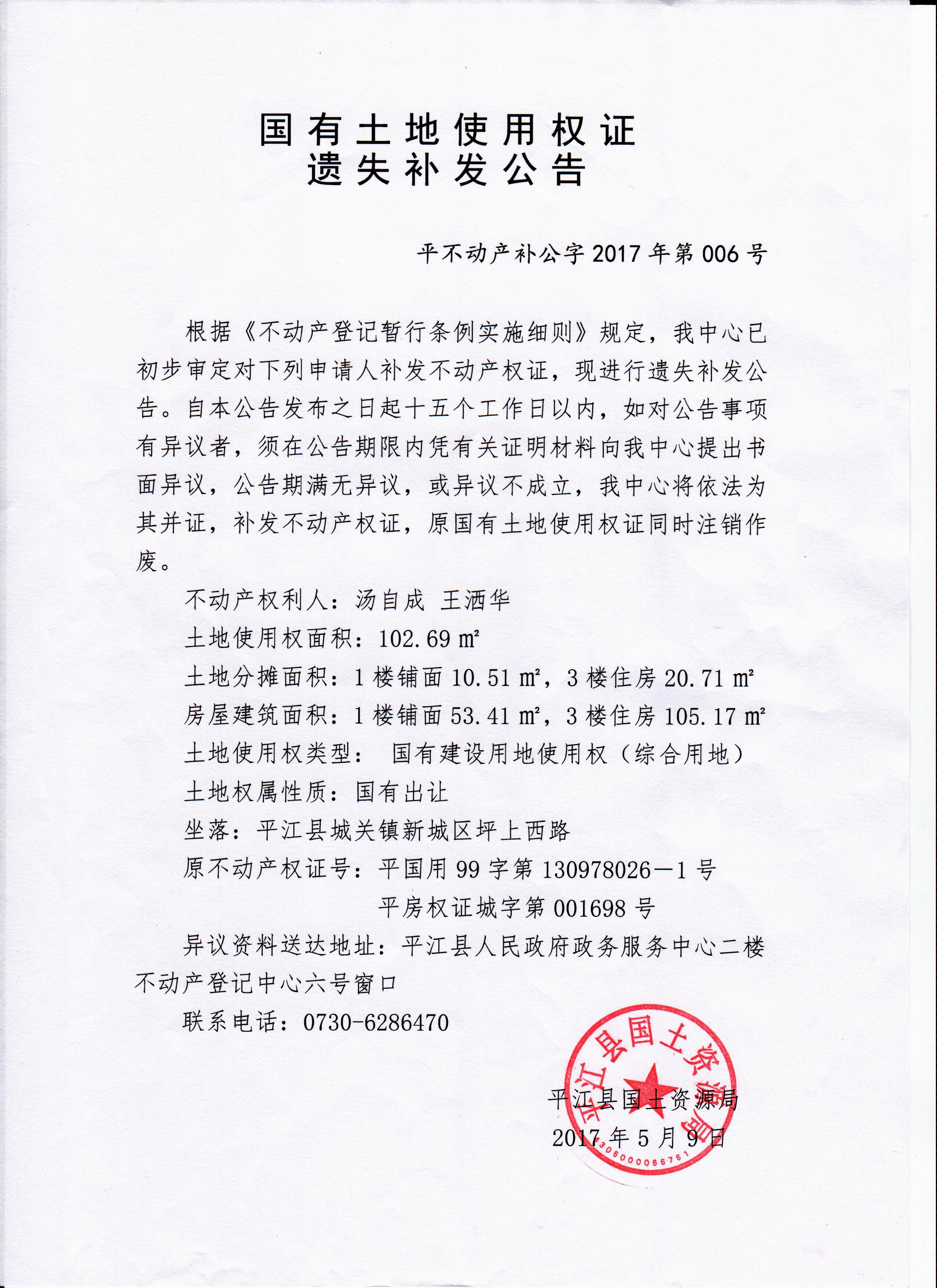 汤自成、王洒华国有土地使用权证遗失补发公告2017006号