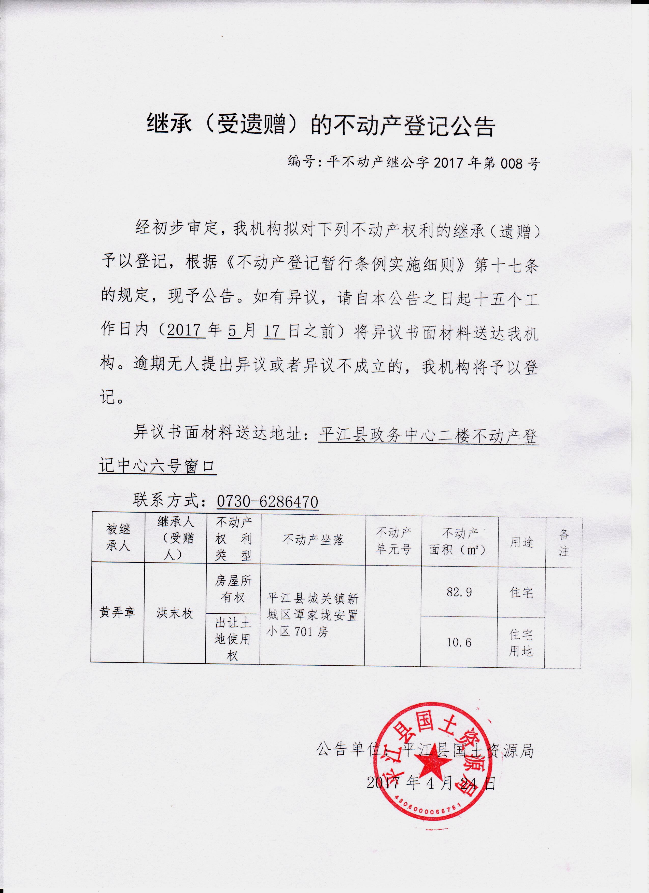 洪末枚继承不动产登记公告2017008号