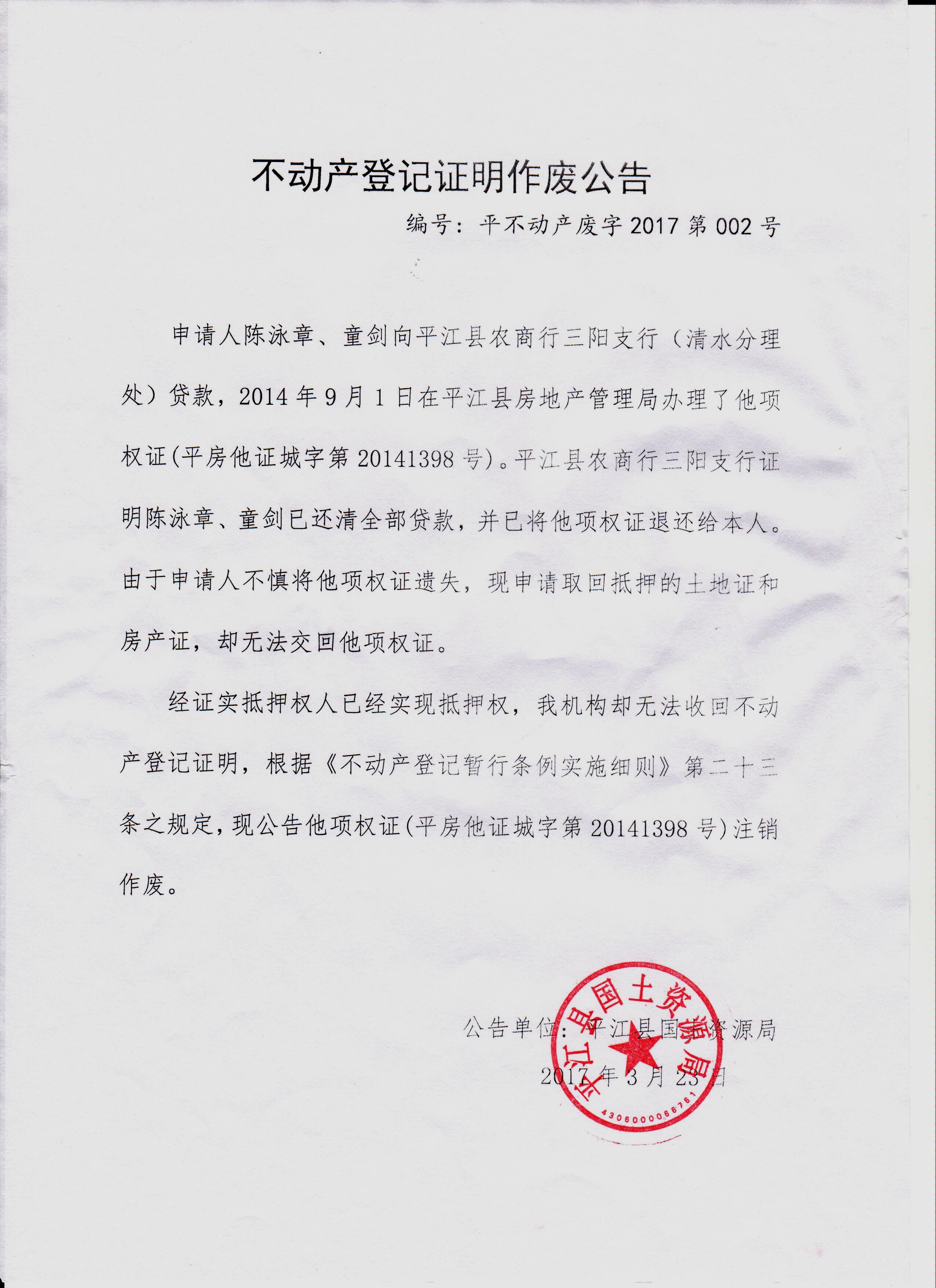 农商行三阳支行(陈泳章、童剑)他项权证20141398号作废公告2017002号