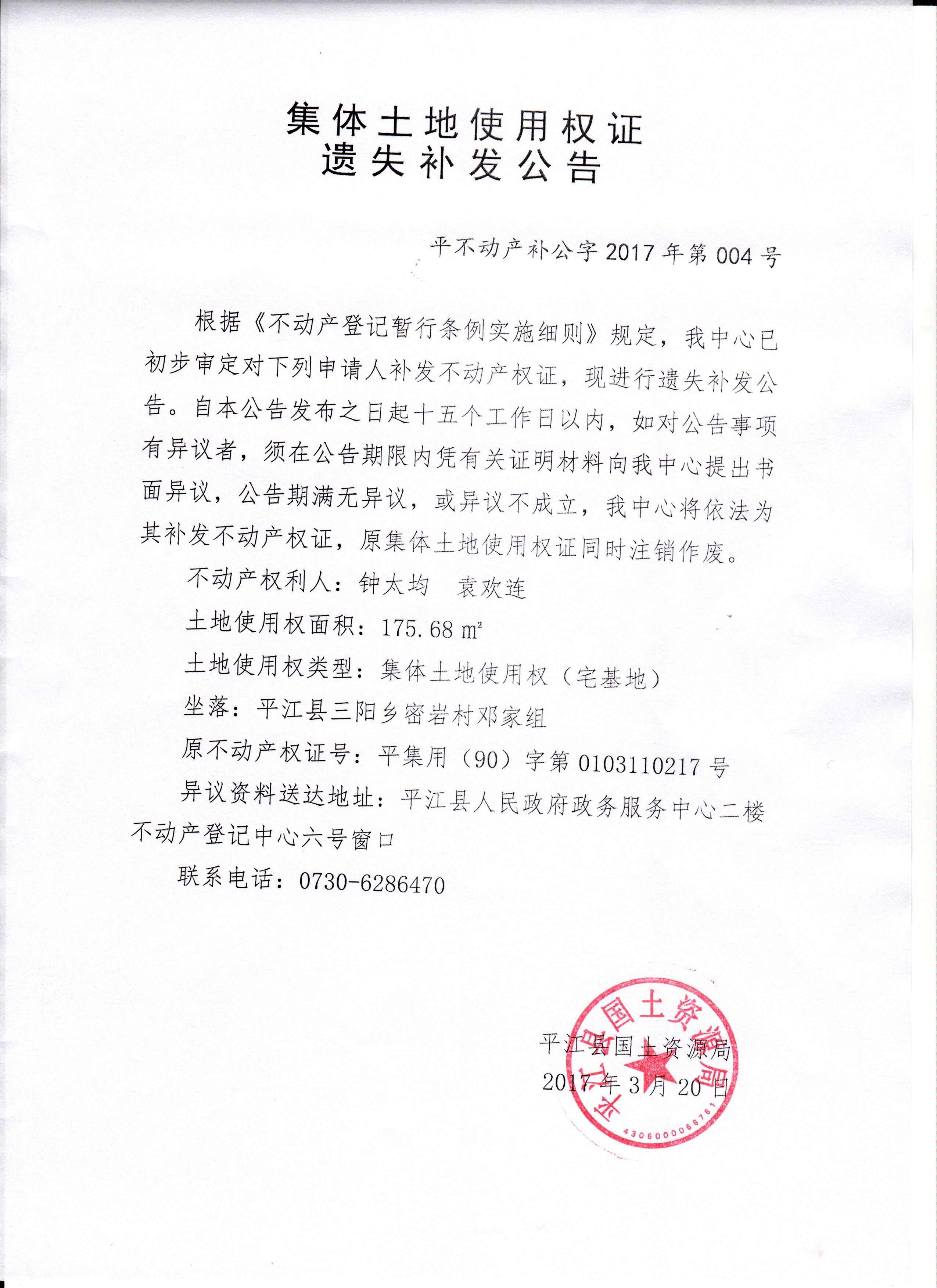 钟太均集体土地使用权证遗失补发公告2017004号