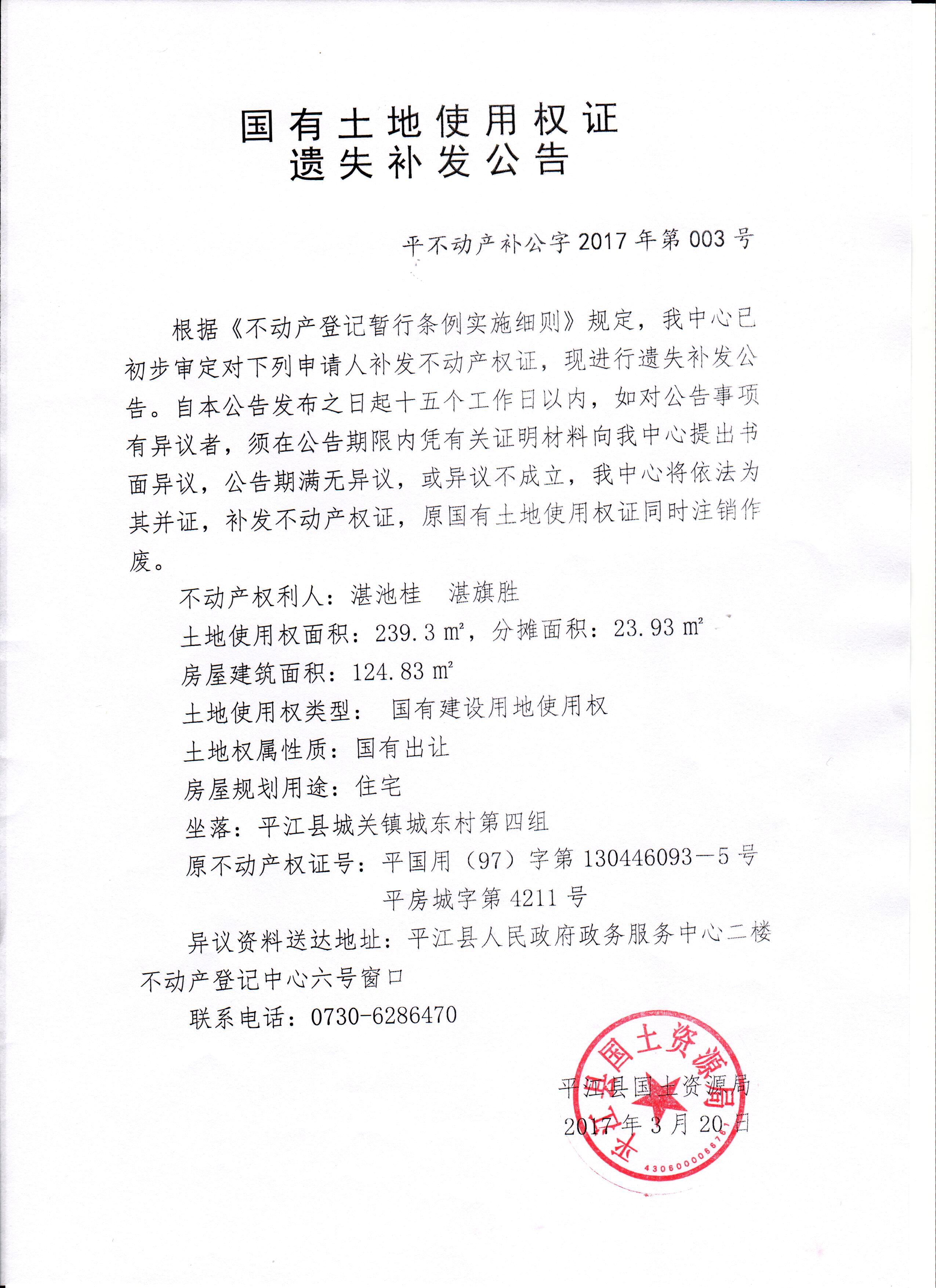 湛池桂、湛旗胜国有土地使用权证遗失补发公告2017003号