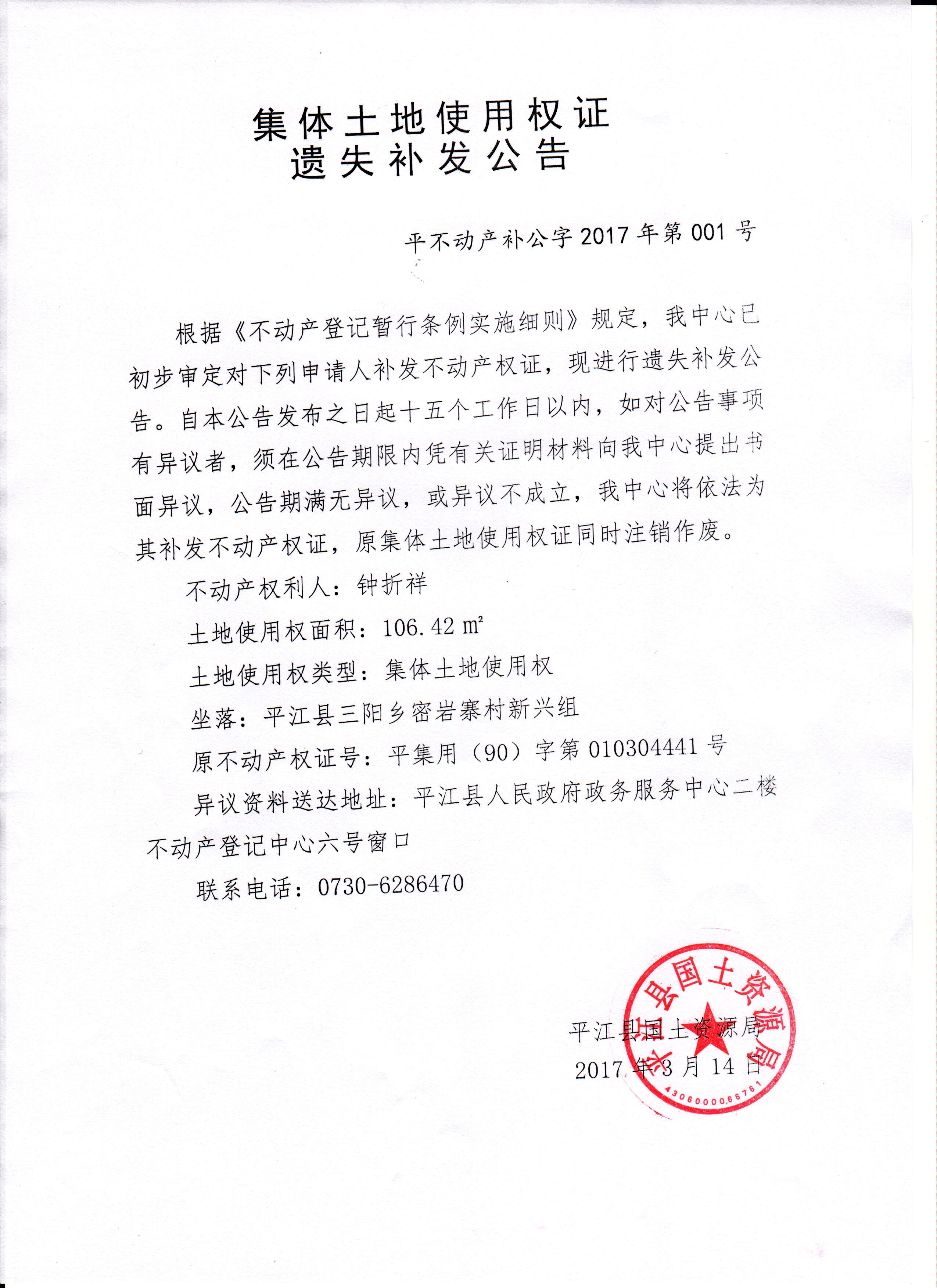 钟折祥集体土地使用权证遗失补发公告2017001号
