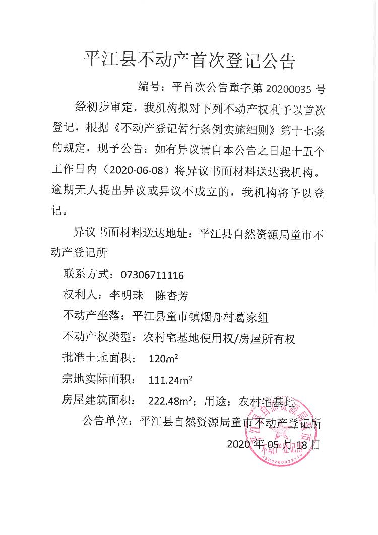 李明珠 陈杏芳不动产首次登记公告