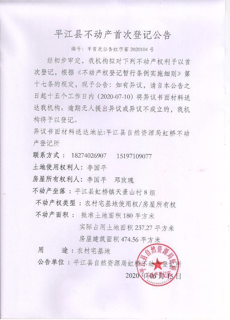 李国平 邓玫瑰不动产首次登记
