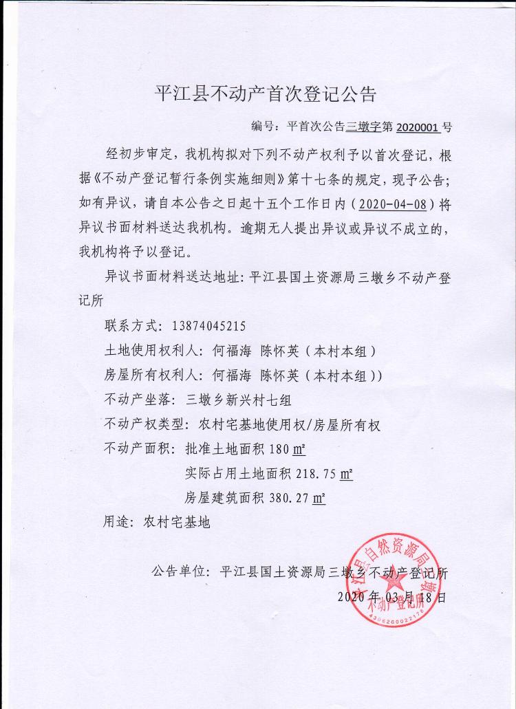平首次公告三墩字第2020001何福海