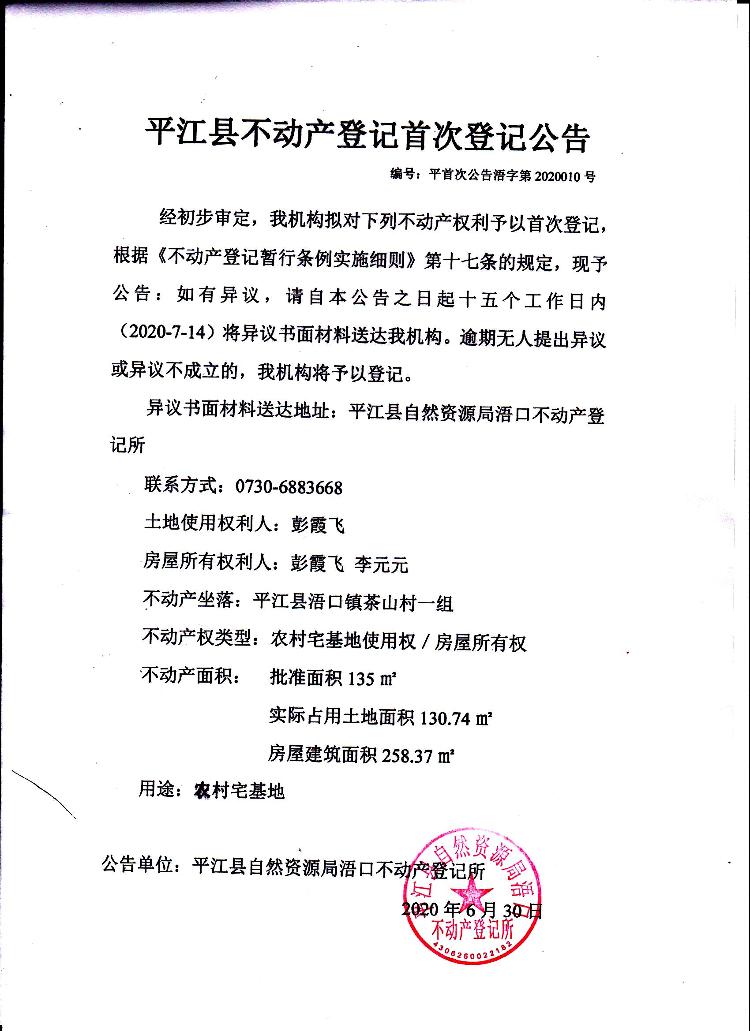 彭霞飞 李元元 平江县不动产首次登记公告 浯字第2020010号