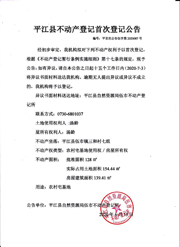 汤龄 平江县不动产首次登记公告伍字第2020087号