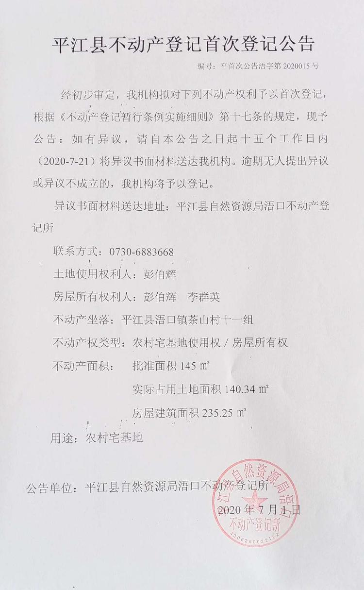 彭伯辉 李群英平江县不动产首次登记公告 浯字第2020015号