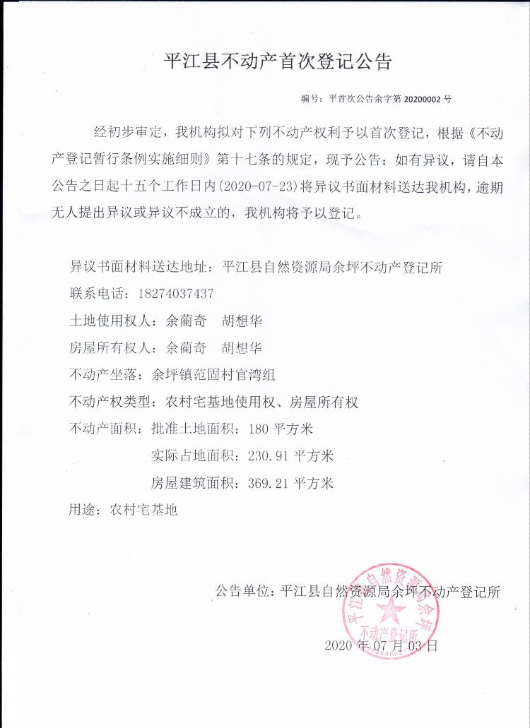 余蔺奇 胡想华平江县余坪镇房屋登记公示