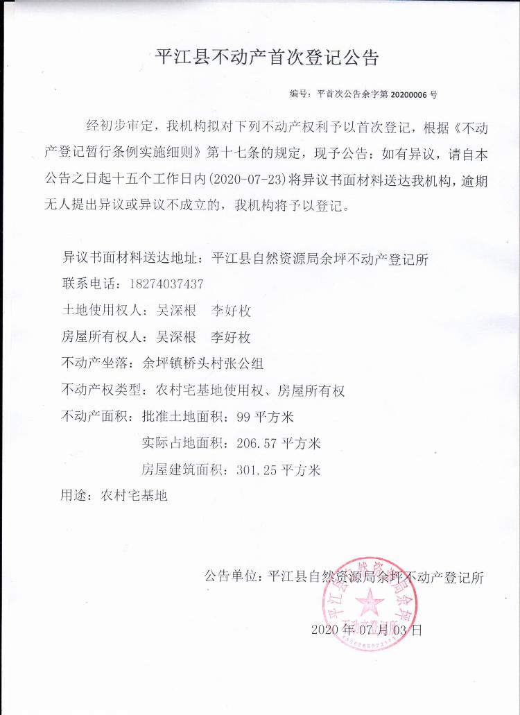 吴深根 李好枚平江县余坪镇房屋登记公示