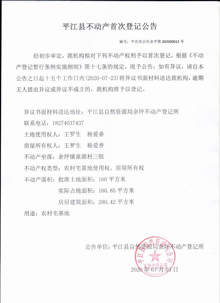 王罗生 杨爱香平江县余坪镇房屋登记公示