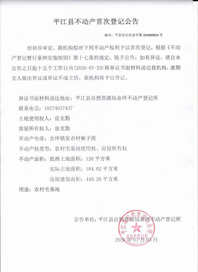 皮克勤平江县余坪镇房屋登记公示