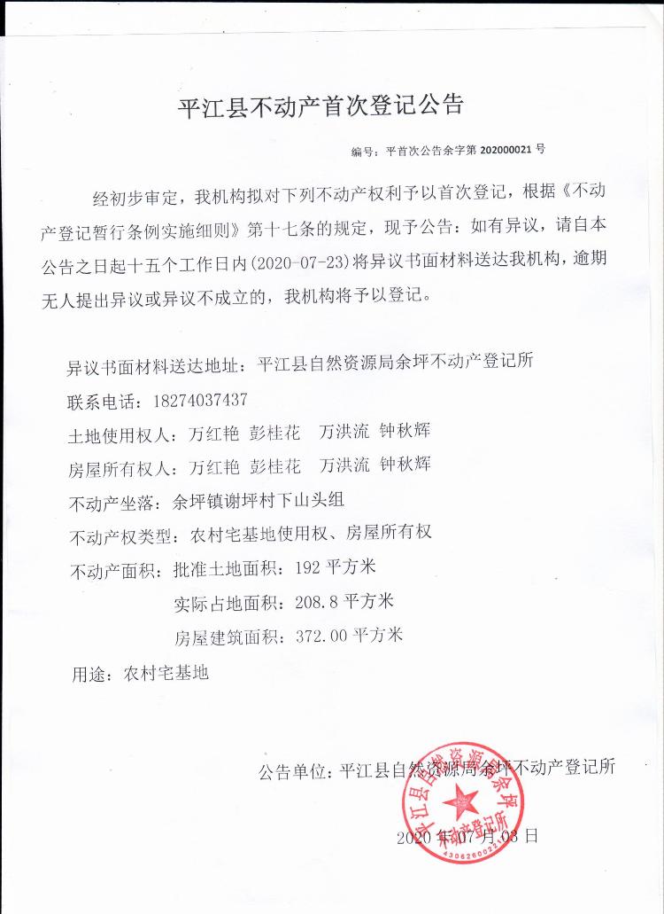 万红艳 彭桂花 万洪流 钟秋辉平江县余坪镇房屋登记公示
