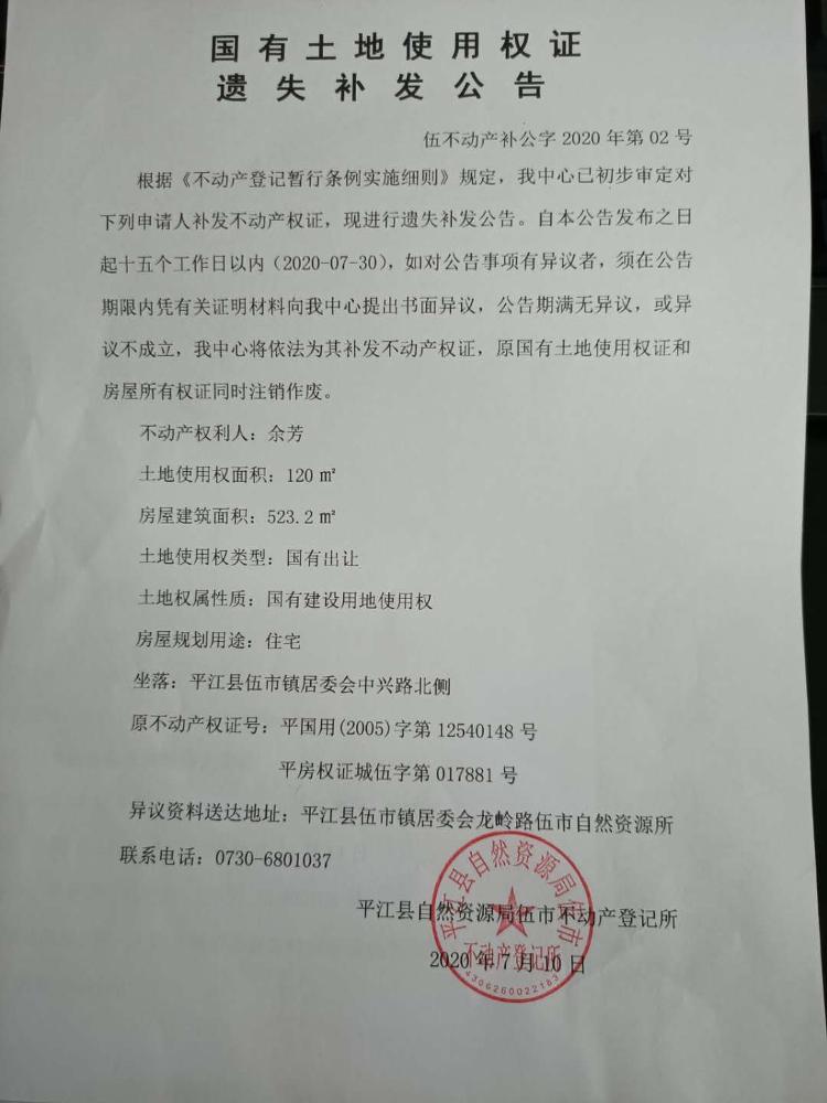 余芳 遗失补发公告 伍不动产补公字2020年第02号