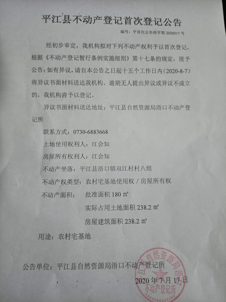 江会知 首次登记公告 平首次公告浯字第2020017号