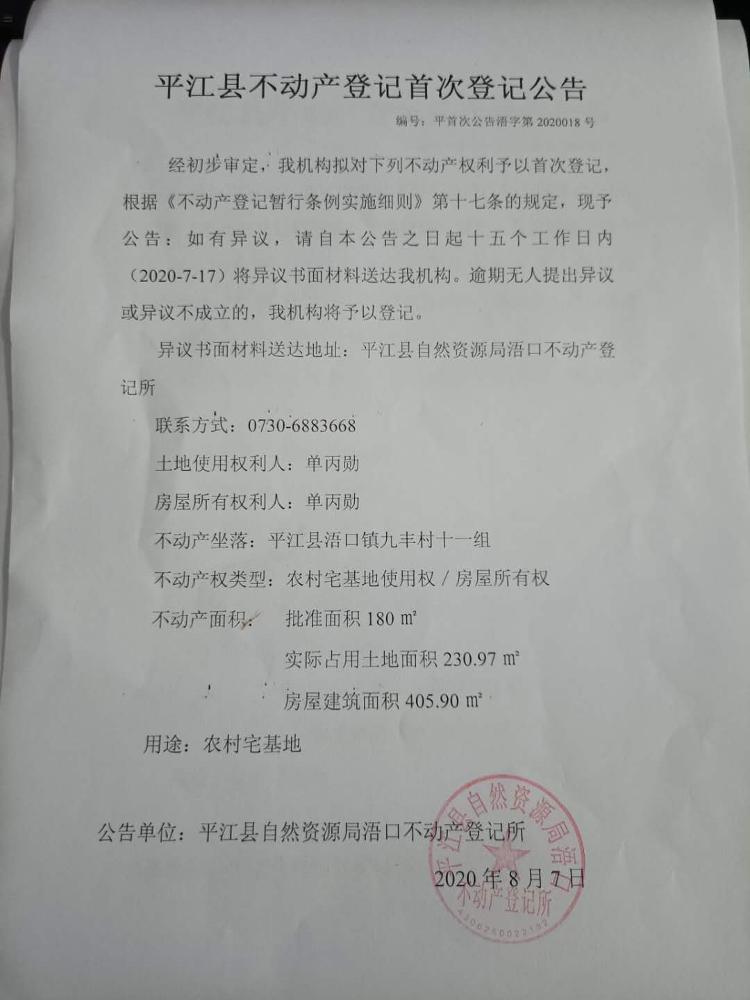 单丙勋 首次登记公告 平首次公告浯字第2020018号