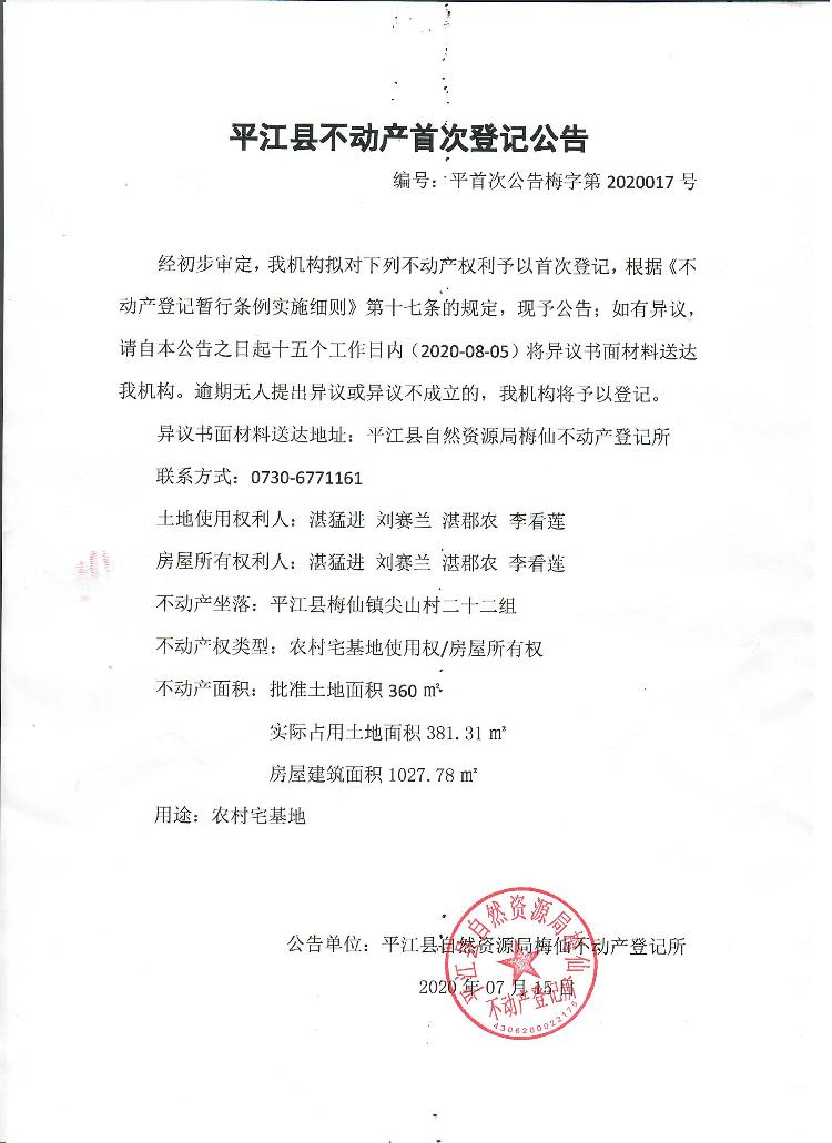 湛猛进 刘赛兰 湛郡农 李看莲不动产首次登记公告