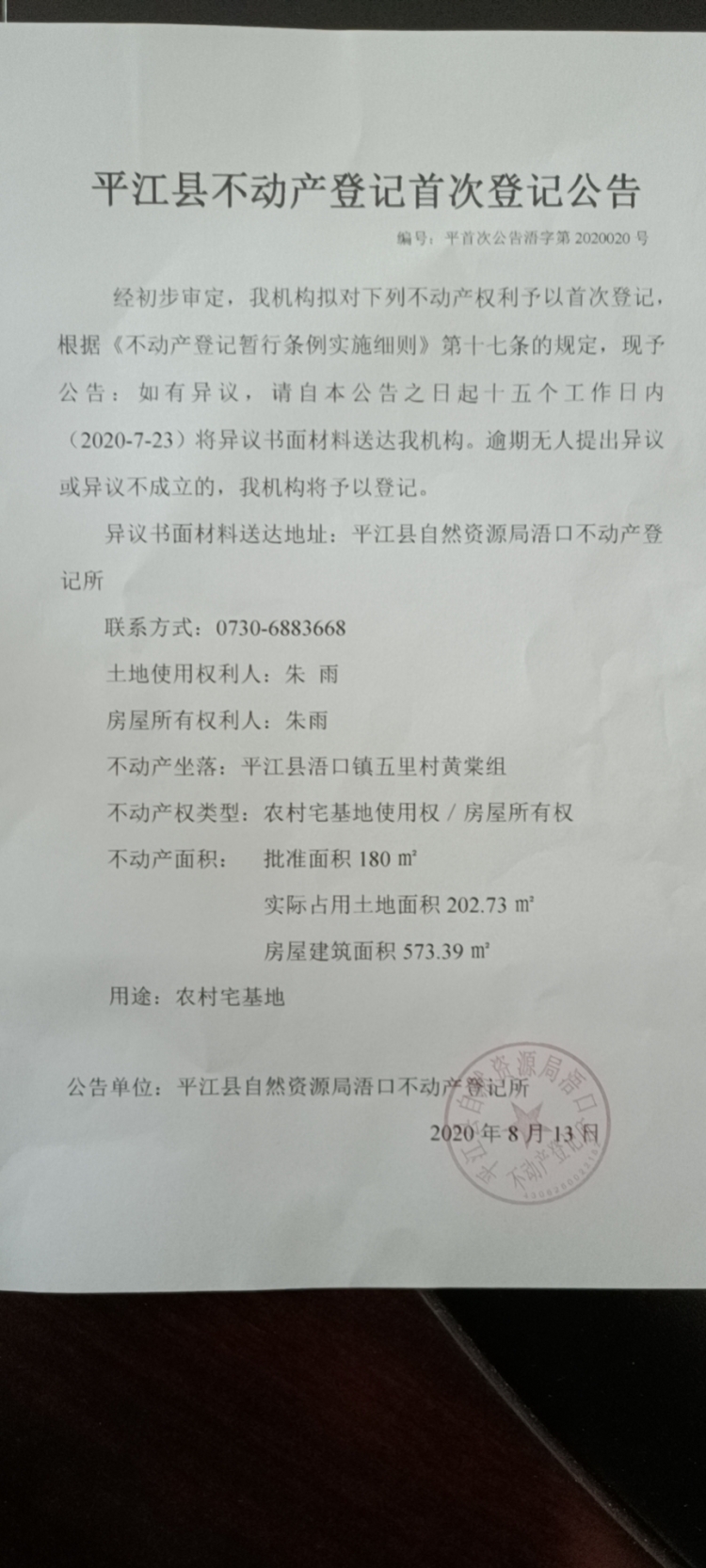 朱雨 首次登记公告 平首次公告浯字第2020020号
