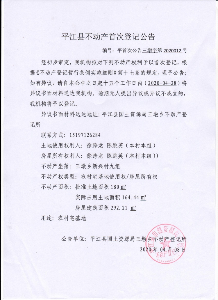 平首次公告三墩字第2020012徐跨龙 陈跳英