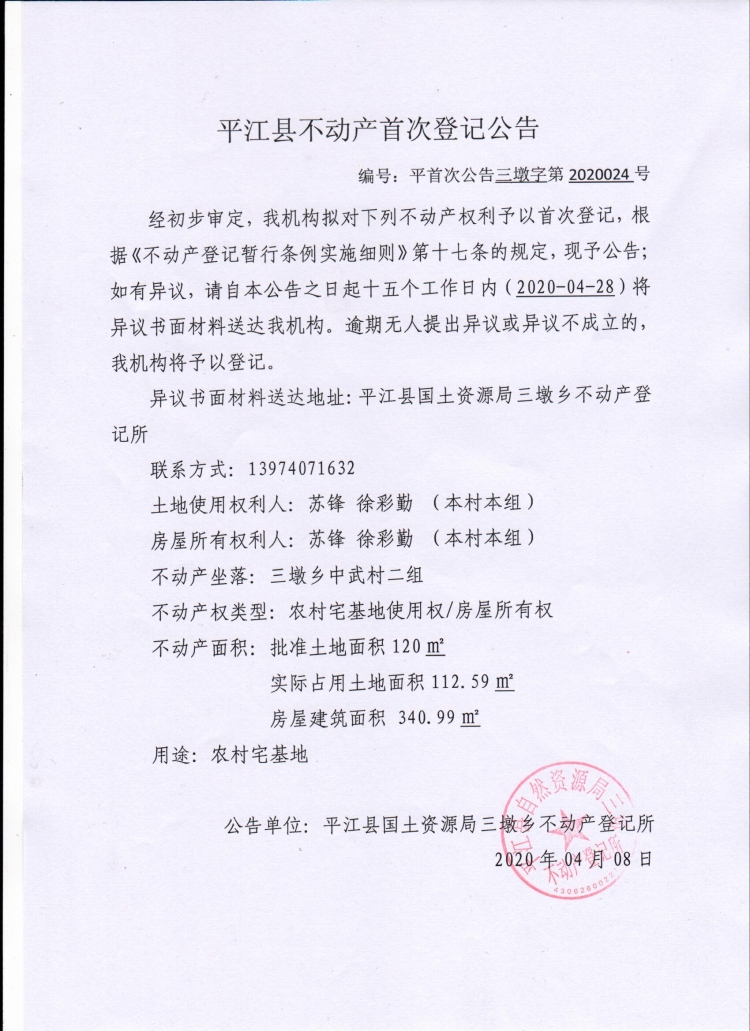 平首次公告三墩字第2020024苏锋 徐彩勤