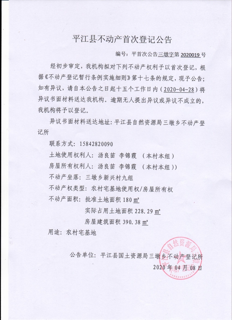 平首次公告三墩字第2020019汤良苗 李锦霞
