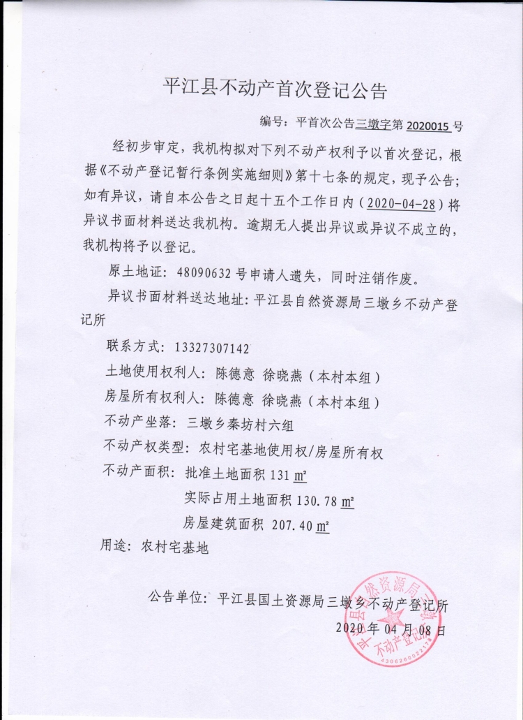 平首次公告三墩字第2020015陈德意 徐晓燕