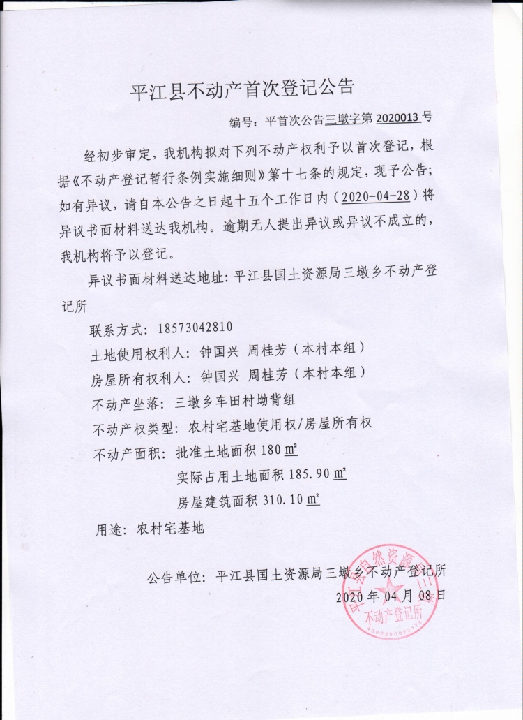 平首次公告三墩字第2020013钟国兴 周桂芳