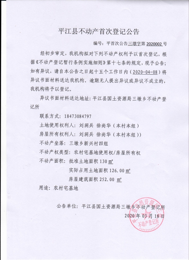 平首次公告三墩字第2020002刘洞兵 徐尚华