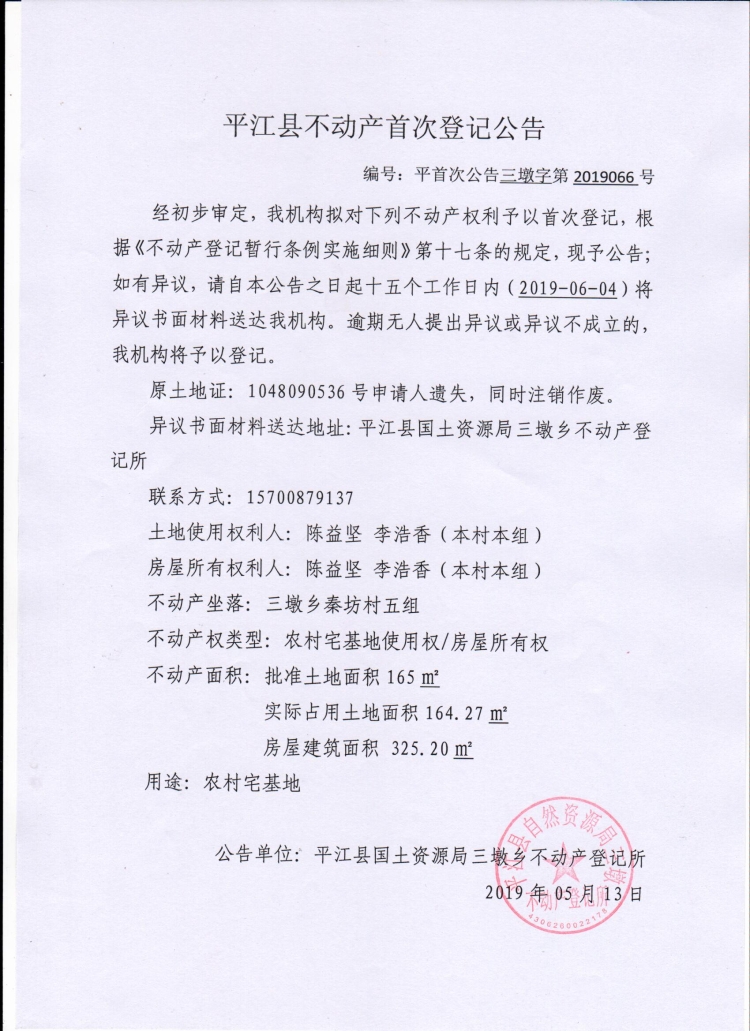 平首次公告三墩字第2019066陈益坚 李浩香