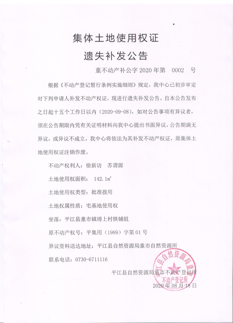 徐新访 苏谓源 集体使用权证遗失补发公告!