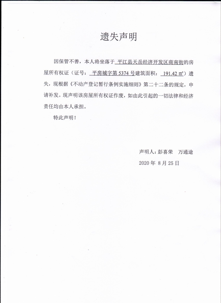 彭喜荣、万通途房屋所有权证遗失声明.jpg