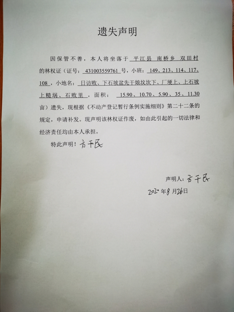 方干民林权遗失声明