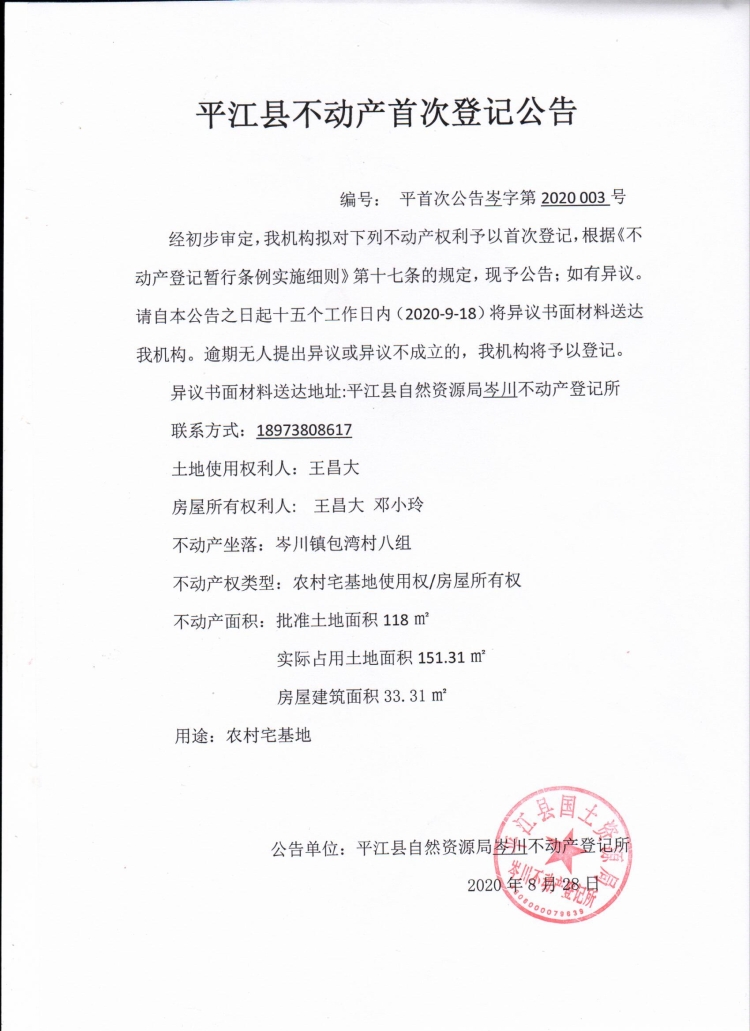 平首次公告岑字第2020003号-王昌大 邓小玲