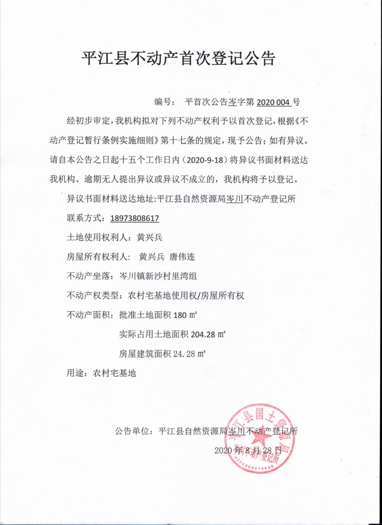 平首次公告岑字第2020004号-黄兴兵 唐伟连