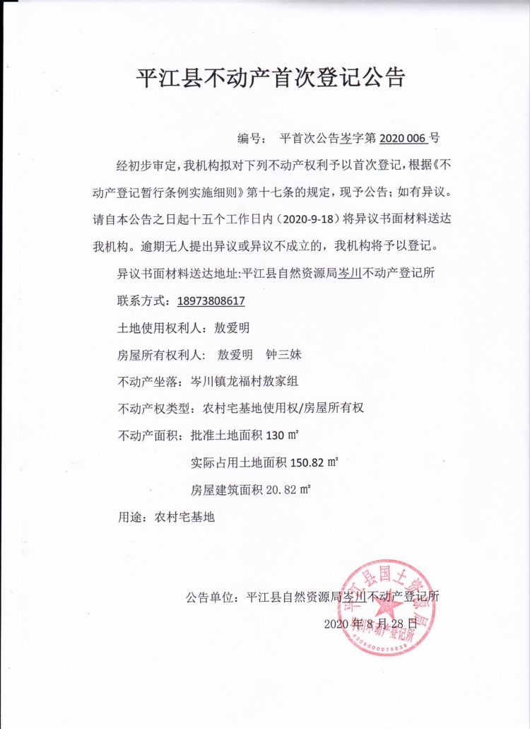 平首次公告岑字第2020006号-敖爱明 钟三妹