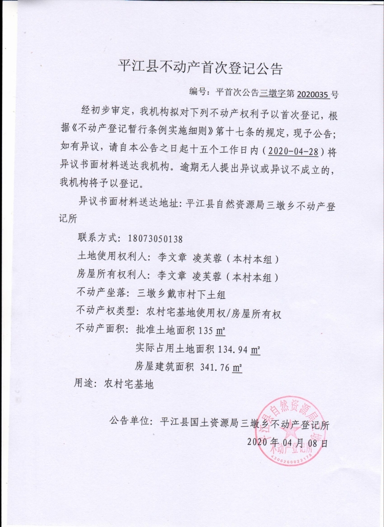 平首次公告三墩字第2020035 李文章 凌芙蓉