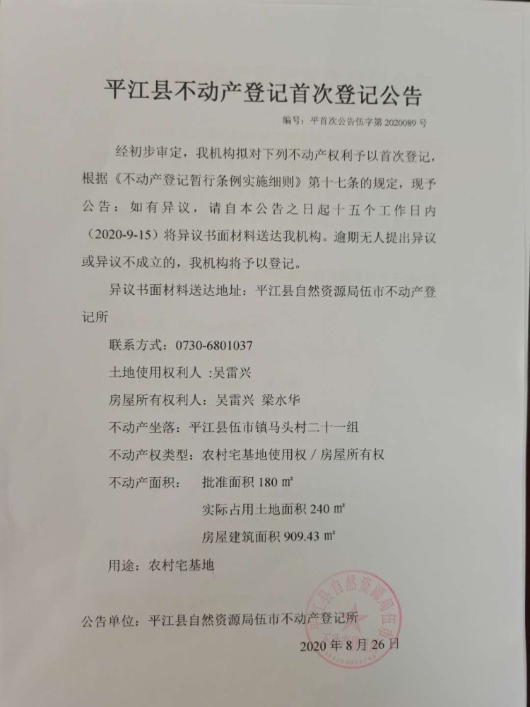 吴雷兴 梁水华 平江县不动产首次登记公告 伍字第2020089号