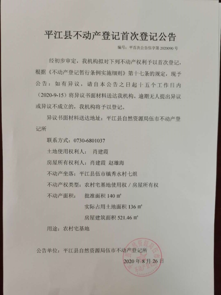 肖建霞 赵雄海 平江县不动产首次登记公告 伍字第2020090号