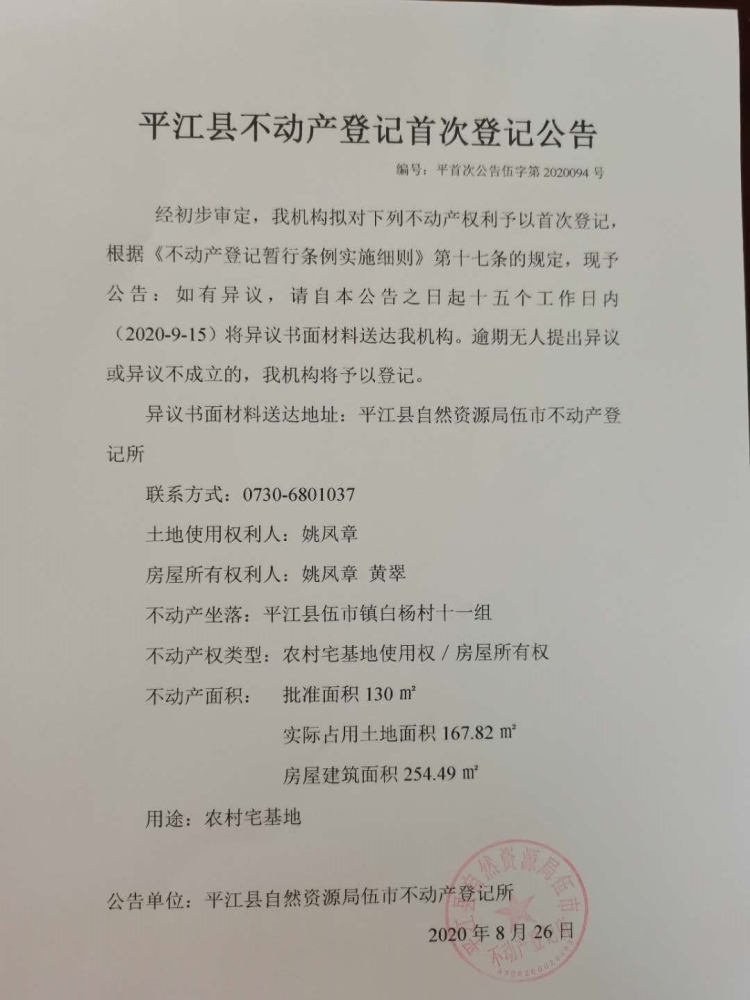 姚凤章 黄翠 平江县不动产首次登记公告 伍字第2020094号