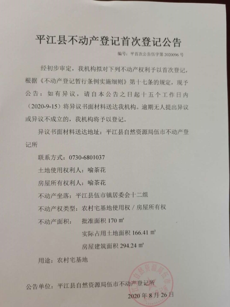 喻茶花 平江县不动产首次登记公告 伍字第2020096号
