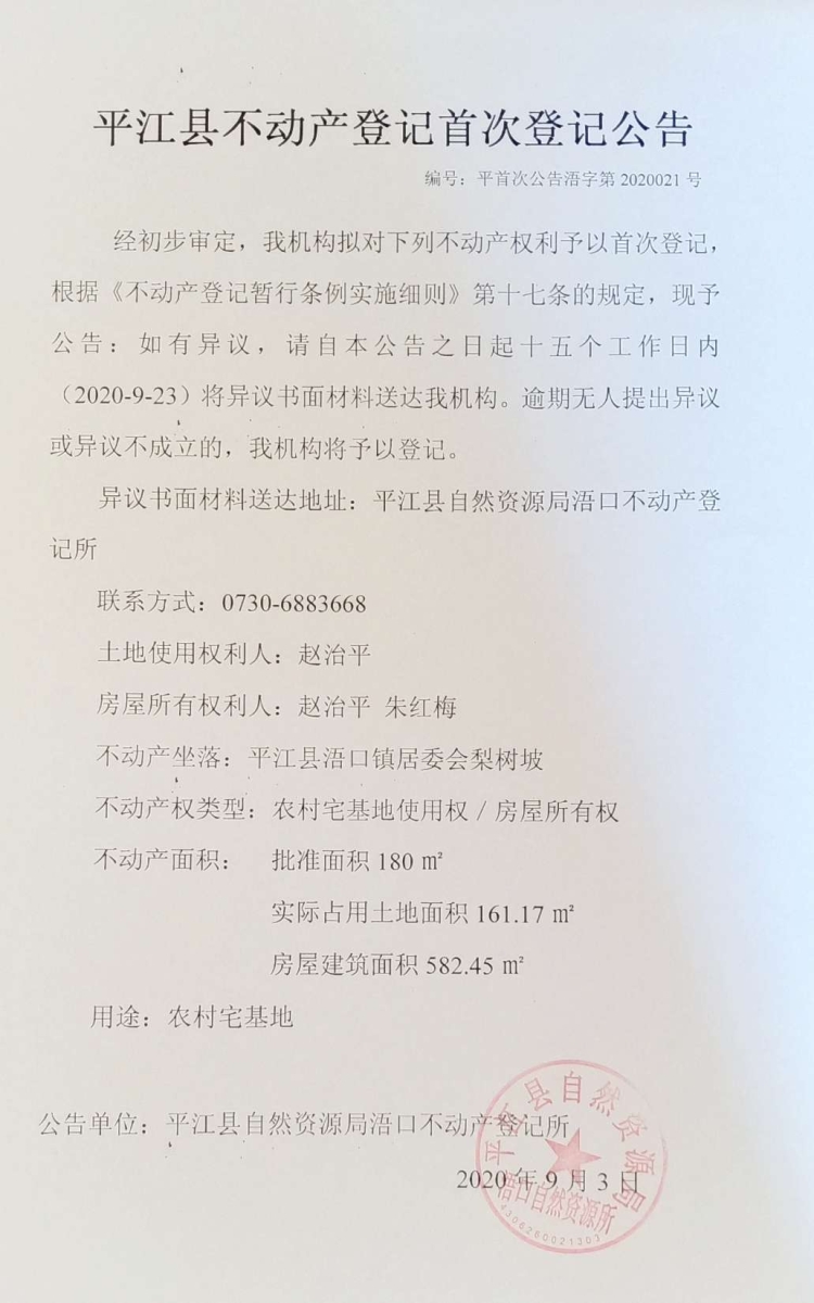 赵治平 朱红梅 平江县不动产首次登记公告浯字第2020021号