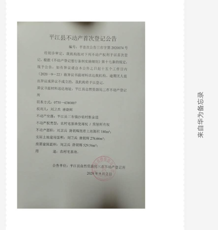 刘卫兵 唐朝辉不动产首次登记公告