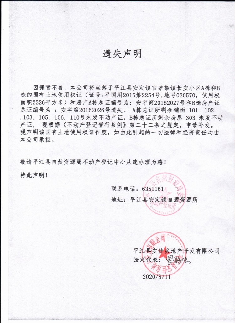 安定镇安佳房地产有限公司国有土地使用权证和房产证遗失声明