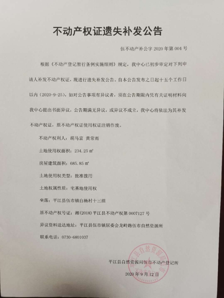 胡马富 黄常雨 不动产权证遗失补发公告 伍不动产公字2020年第004号